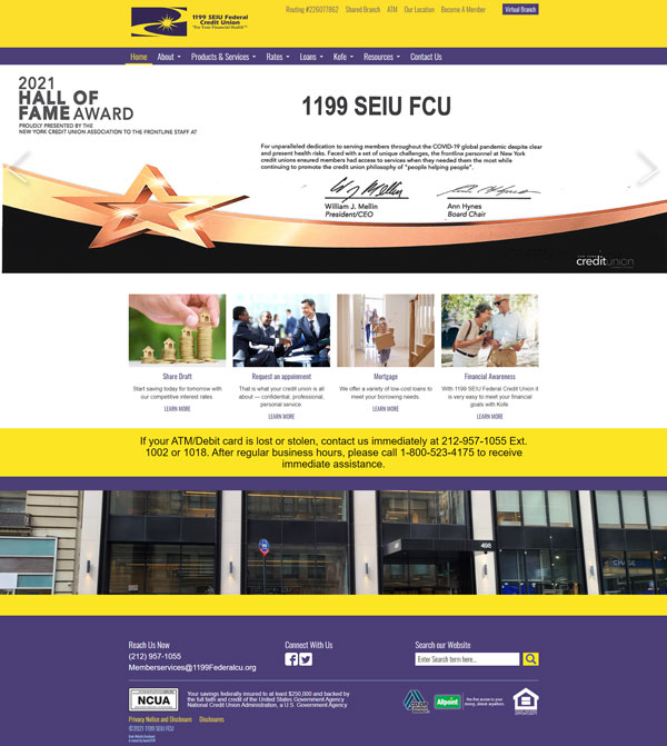 Every detail of the 1199 SEIU Federal Credit Union website fits perfectly in the overall design and it’s well-thought-out. The unusual but appealing contrast of yellow and purple color makes you want to keep on browsing through the website. This website has a simple and functional design and is one of our favorite credit union websites.