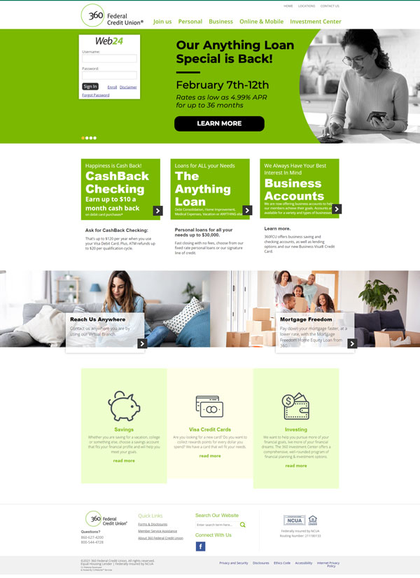 360 Federal Credit Union has implemented a serene palette of colors that are very pleasant to the eye. The combination of light green and white on this website seems perfect and serves its purpose – to preserve the attention of the visitors. Although placed at the center of the website their Call-to-action section is not at all intrusive and should prompt all visitors to click on it to get more information. Furthermore, the existing customers can log in to their online accounts without any trouble because the registration box is right in the central part of the website. And let’s not forget to mention that 360 Federal Credit Union paid attention to every detail and made their website ADA compliant in all aspects.