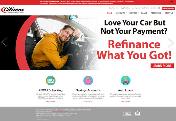 Clearly, this credit union website is intended for young people, especially students. This is mainly due to the fact that they offer some services and products specifically designed for them. There are some colorful icons and eye-catching images as an addition to the simple, but effective overall design.