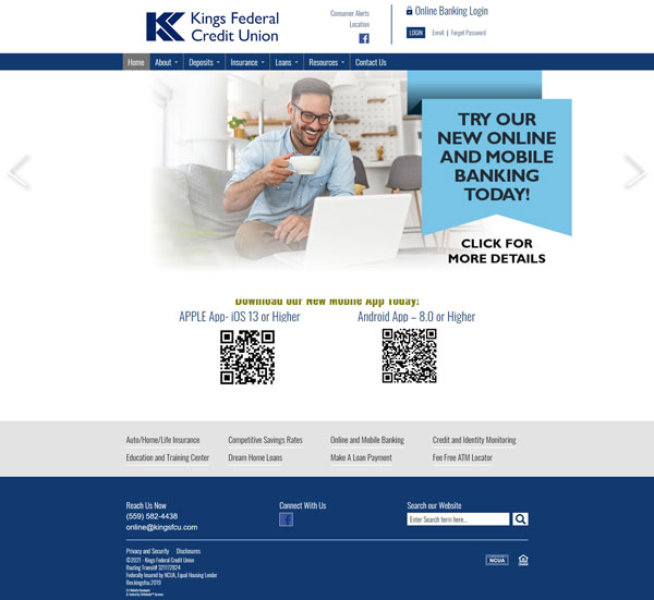 Once you land on the Kings Federal Credit Union website you can enjoy the nice sliding images selected for the central part of their website combined with calming blue and white colors. Everything is well-organized and easy to navigate. At the top of the page, customers have the option to log in to their online accounts and find all local branches near them. Maybe one of the best features of this website is that they are mobile-friendly and for that reason, they have placed the QR codes for easy download of their mobile apps on their landing page. In that way, all their customers can switch to mobile banking easily. Overall, this is a responsive website with clear navigation.